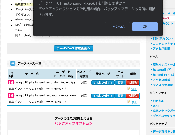 ただし、Wordpressの主にブログ記事などを保持するデータベースは別途削除が必要です。