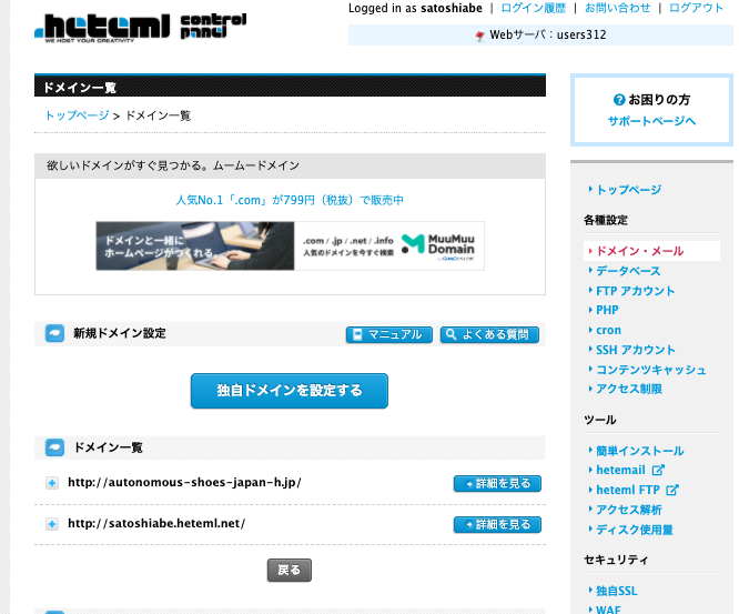 そのため、他サービスで独自ドメインを取得して、そのドメインをヘテムルのサーバーに追加する必要があります。