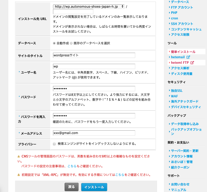 そして、下記を入力・選択するだけで、Wordpressのインストールを開始できます。