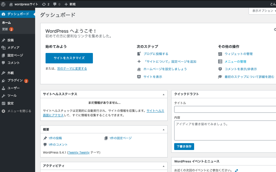 こちらも、Wordpressユーザーにとって共通したデザインの、ダッシュボード(管理画面)です。