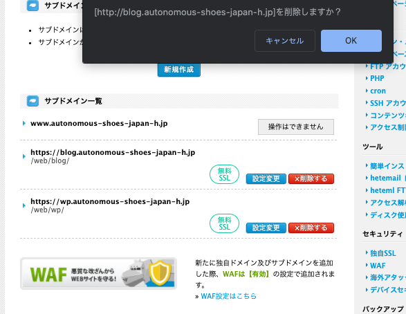 これでサイトへのアクセスができなくなり、実質的にはWordpressのアンインストール・サイト削除をした状態になります。