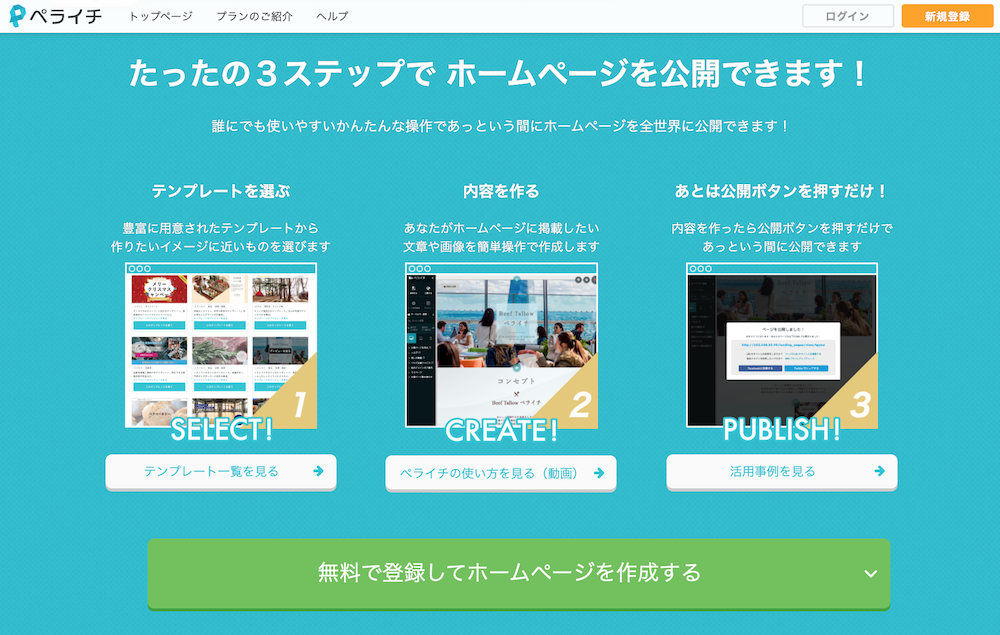 3ステップだけでホームページを公開できる、簡単さを押し出している「ペライチ」のホームページビルダー。