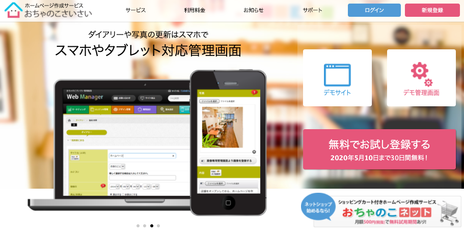 ユニークな名前の「おちゃのこさいさい」は、主に店舗がホームページを容易に制作できるための、ホームページビルダーサービスです。