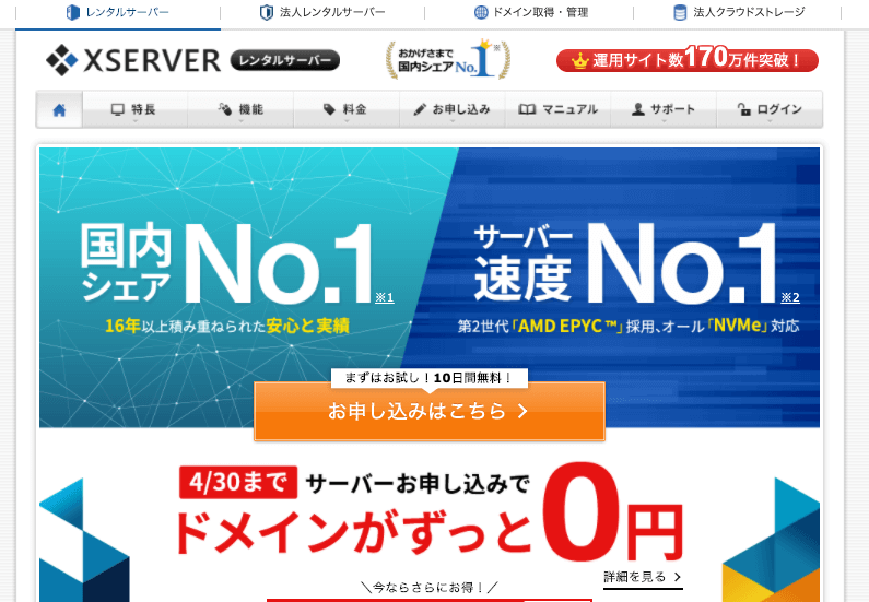 15年以上の歴史があり、180万件以上もの運用サイトの実績と、国内最大級のシェアを誇る「エックスサーバー」のレンタルサーバー。