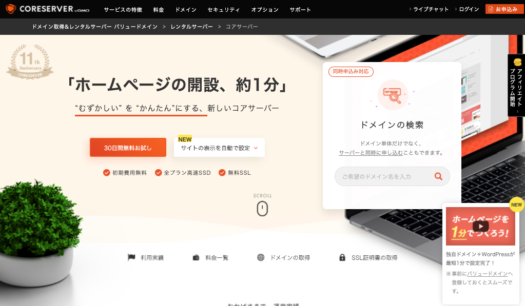 GMOグループが展開するコアサーバーのレンタルサーバーは、格安でWordpressサイト運用機能をしっかり提供し、初心者向けの簡単さやサイト公開までの速さをメリットとしています。
